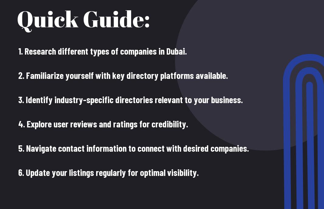 Most people navigating Dubai’s business environment encounter the city’s complex company directories without a clear roadmap. In this guide, you’ll discover five necessary steps that will transform your understanding of these directories, enabling you to efficiently find the information you need. From recognizing the key directories to leveraging them for your business needs, this comprehensive approach will empower you to navigate Dubai’s corporate landscape with confidence. Dive in to enhance your business strategy in one of the world’s most dynamic markets!